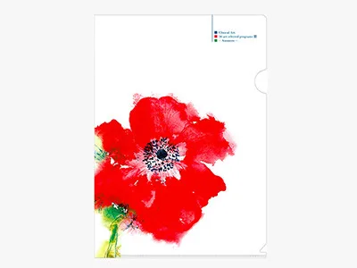 - アートプログラム36選-Ⅲ「アネモネを描く」をモチーフにしたデザインです。表面右上には英語でアートプログラム名が入り、アネモネの背景はホワイトの半透明です。裏面のネイビー部分は透明仕様になっています。大胆な赤と落ち着いたネイビーのコントラストがポイントです。